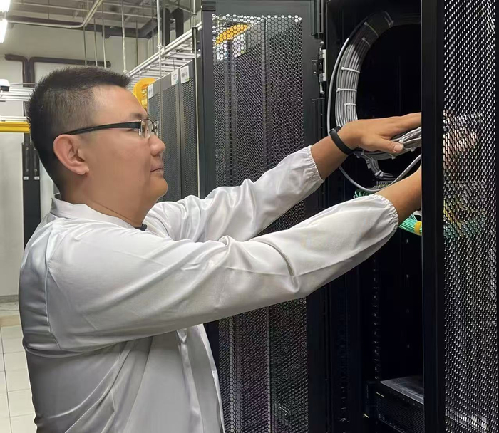 中国移动呼和浩特数据中心算力网络运维工程师赵一帆正在进行设备线缆检查。(受访者供图)中国移动呼和浩特数据中心副总经理李程贵表示,凭借专业运维团队和先进技术,该数据中心能完成万亿级参数大模型的稳定训练,创下连续22天无中断训练纪录。