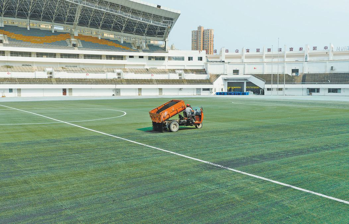 在足球场核心区域,7700余平方米的人工草坪已全部铺设完毕,工作人员正驾驶专业设备开展颗粒填充作业,进一步提升场地运动性能;环绕球场的塑胶跑道面层施工同步有序进行,工人们沿着跑道仔细刮涂胶水;配套功能用房建设已进入收尾冲刺阶段,室内墙体粉刷全面完工,空调系统正在加紧安装。